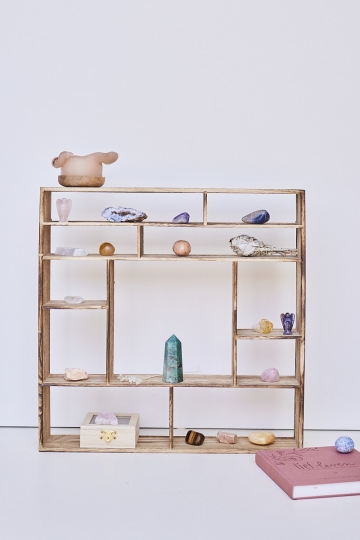 Licht houten altaar om op te hangen of neer te zetten. Je kunt er edelstenen, beeldjes en vondsten uit de natuur in zetten om jouw eigen zen plekje in huis te creëren of een dierbare te herdenken.
