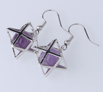 Prachtige hexagram edelsteen oorbellen met een amethist bol erin.